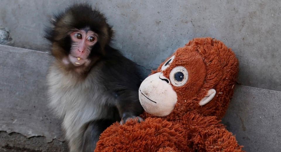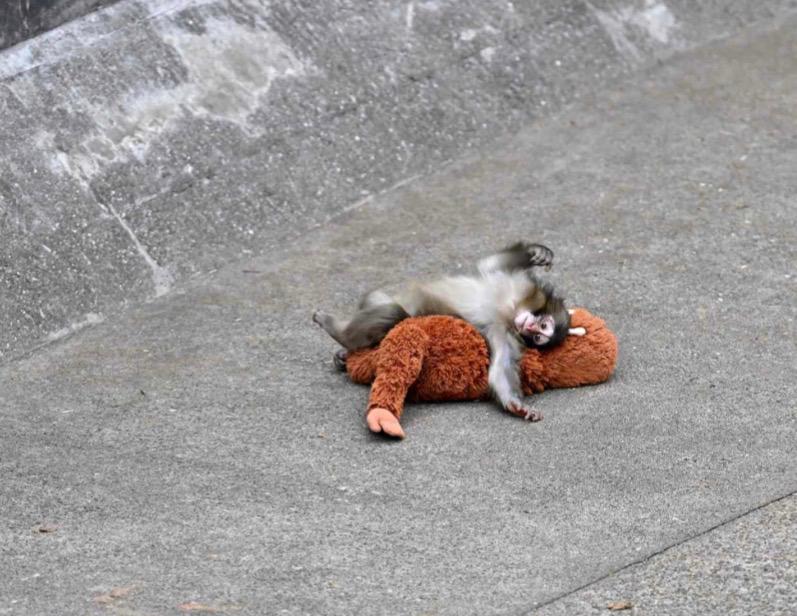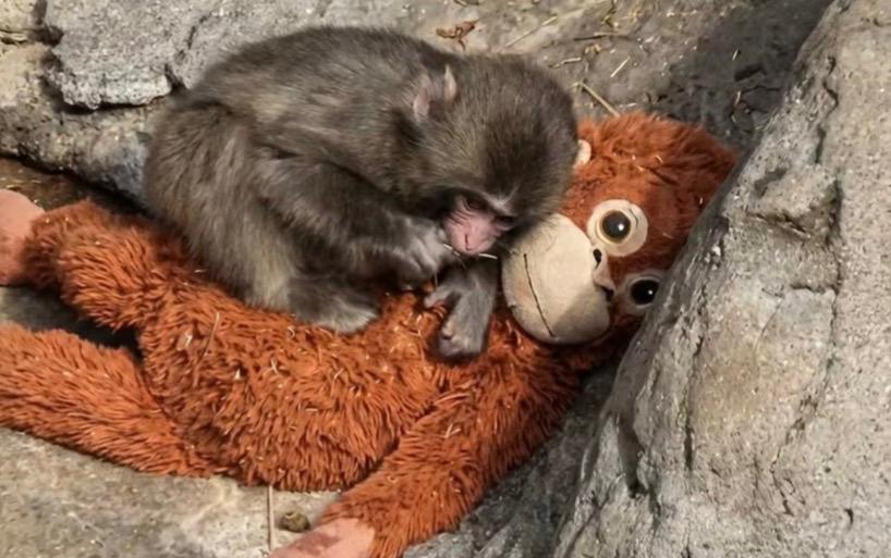 Pour l’aider à se sentir moins seul, les soigneurs lui ont donné une peluche d’orang-outan. Punch la garde souvent avec lui et s’occupe de lui comme les macaques le font normalement entre eux. Cela montre qu’il cherche du réconfort et un contact social.
