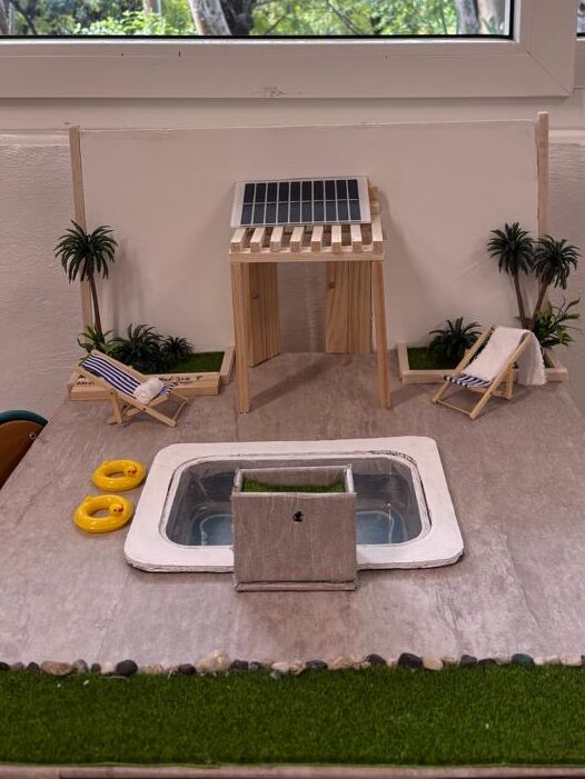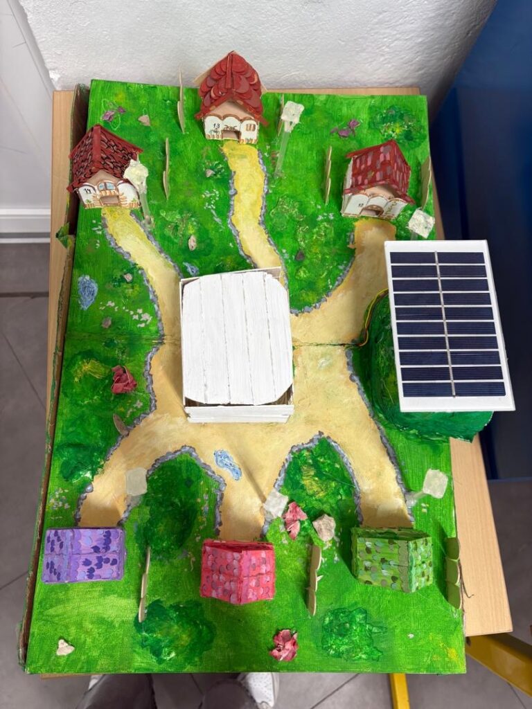 « Notre projet consistait à réaliser une petite cascade fonctionnelle utilisant l’énergie solaire. Un panneau solaire alimente une pompe qui fait remonter l’eau vers le premier bol. Ensuite, l’eau descend en cascade entre les bols grâce au principe des vases communicants. Ce projet montre comment l’énergie solaire peut être transformée en énergie mécanique pour faire circuler l’eau. »